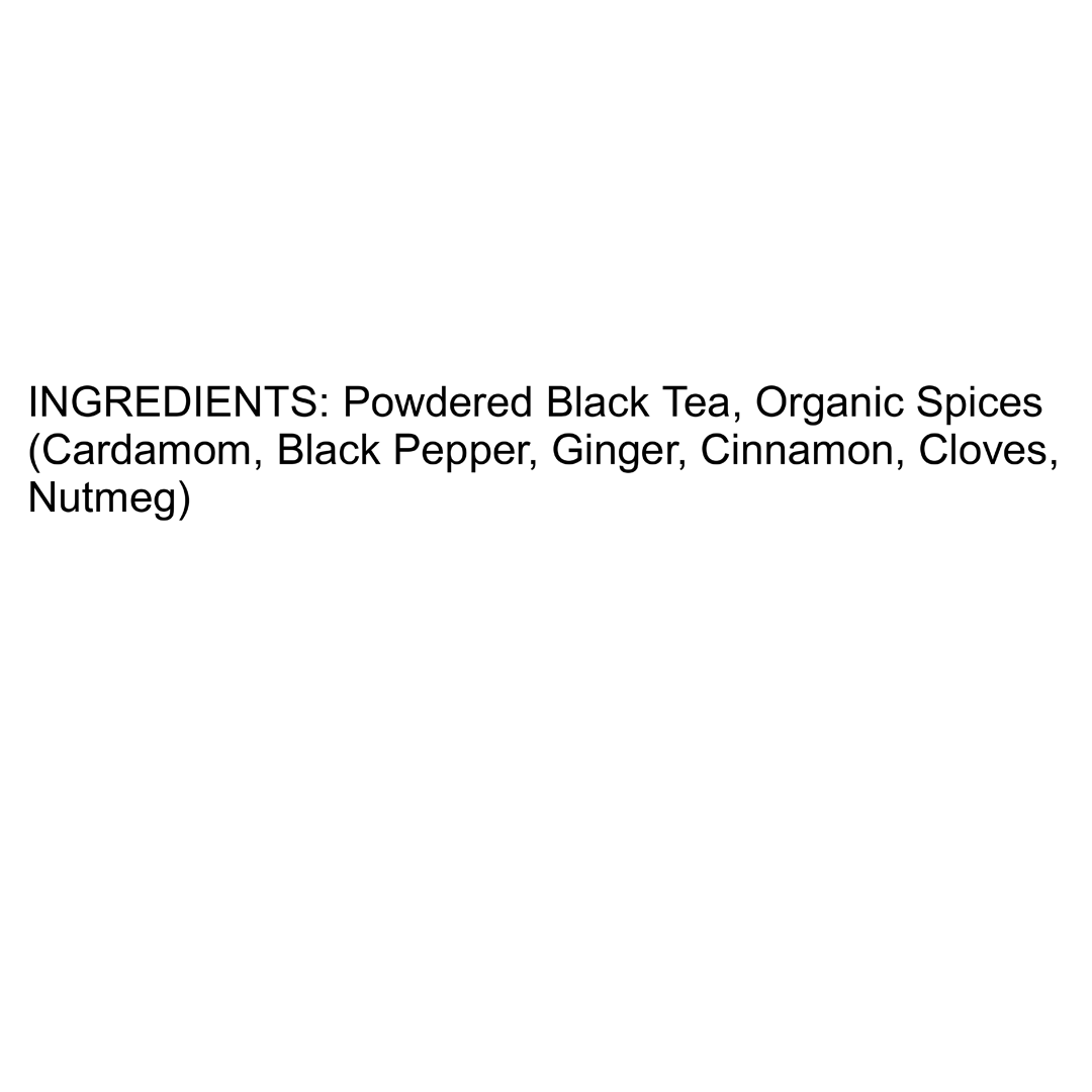 Heirloom Masala Chai (tea) ingredients include ground organic botanicals: Black Pepper, Cardamom, Cinnamon, Cloves, Ginger, Nutmeg; and Naturally Brewed, Flash-Dried and Powdered Black Assam Tea.
